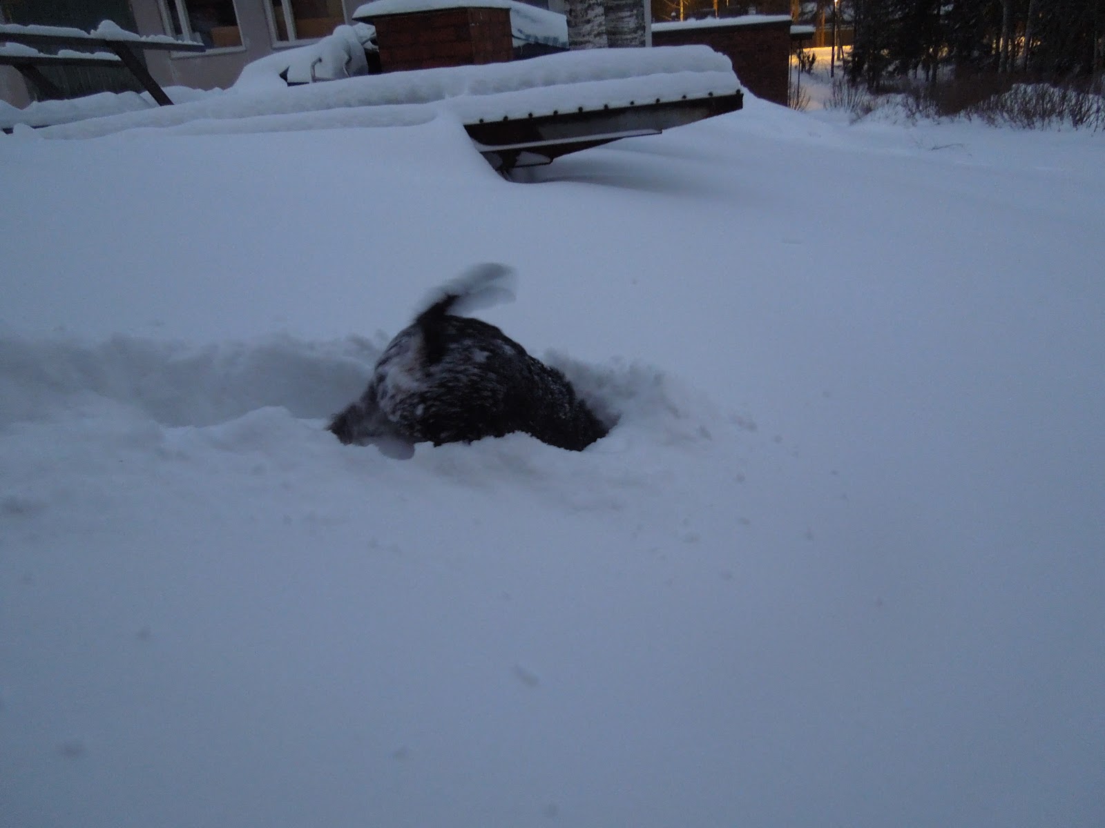 Taiga niin R-A-K-A-S-T-A-A talvea ja lunta. Se ei muuta tekisi kuin viettäisi kaiket päivät ulkona (mieluiten itse siellä lumihangessa). Keppien kantelu ei ole loppunu ja nyt neiti ahkerasti kaivaa niitä lumen alta. Ei näy kuin hiukan Taigan pepusta, kun se pää lumessa, häntä viuhtoen ja tassut kaivaten konyää keppejä lumen alta.